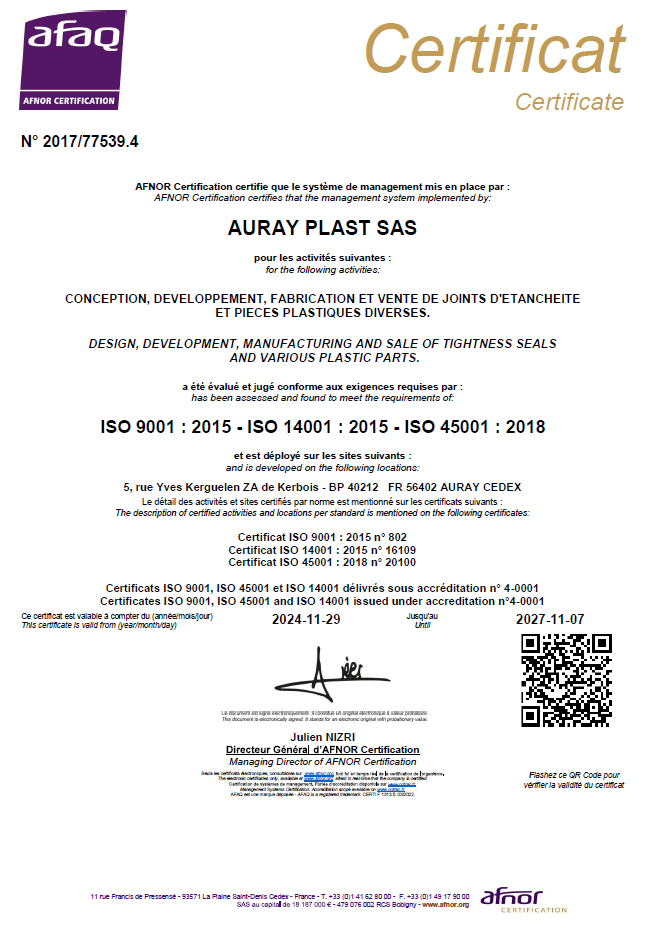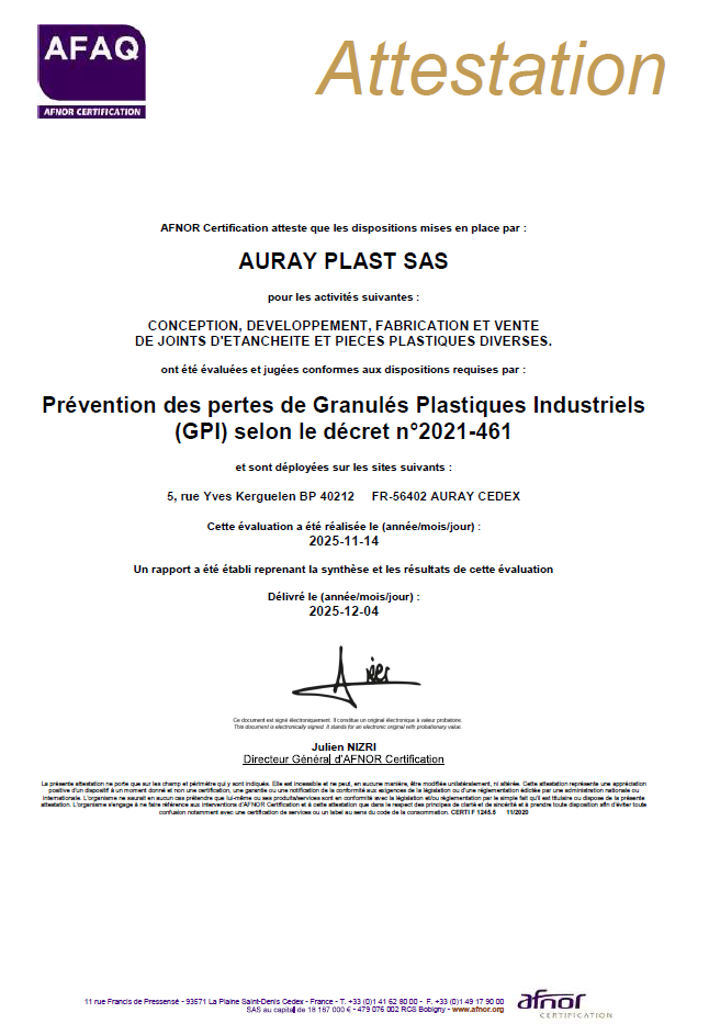 Auray Plast holds quadruple certifications in quality, safety, environment, and energy to guarantee products that meet your specifications.